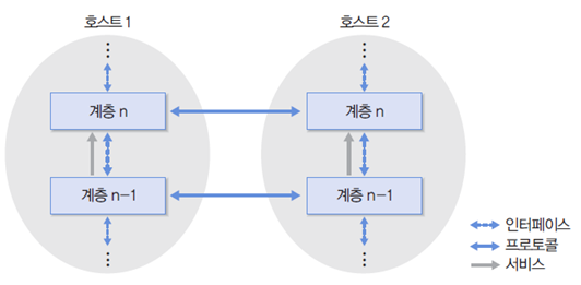 예를 들어, 통신 양단의 한쪽 호스트의 계층 n 모듈은 상대 호스트의 계층 n 모듈과 통신한다.
