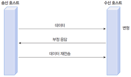 프레임 변형 오류를 인지한 수신 호스트는 송신 호스트에 부정 응답 프레임을 전송함으로써, 원래의 데이터 프레임을 재전송하는 오류 복구 과정이 진행된다.