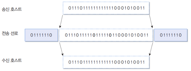 프레임의 시작과 끝 위치에 플래그Flag라는 특수하게 정의된 비트 패턴(01111110)을 사용해 프레임 단위를 구분한다.