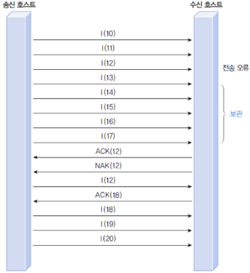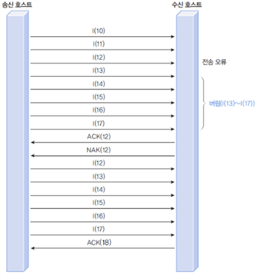 12번 프레임에만 오류가 발생하고 나머지는 모두 오류 없이 수신되었다면 오류 복구 과정에서 오류가 발생한 12번 프레임을 포함해 이후에 전송된 모든 정보 프레임을 재전송하는 방식을 고백 NGo-Back-N 방식이라 한다.
