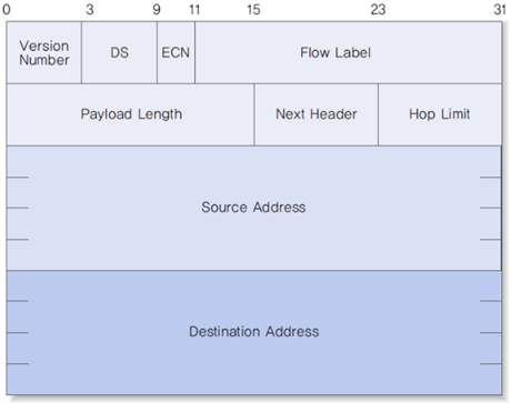 송신 호스트와 수신 호스트의 주소를 표시하는 공간이 32비트에서 128비트로 확장되었다. - 헤더 구조 단순화