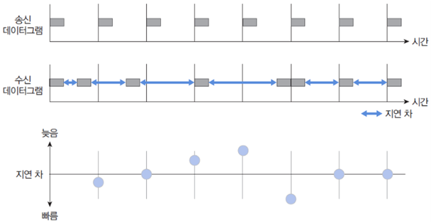 송신 프로세스가 전송한 데이터는 데이터그램 사이의 시간 간격이 일정하다가 인터넷을 거쳐 수신 프로세스에 전달되는 과정에서 간격이 불규칙하게 변한다.