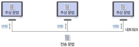 이렇게 함으로써 전송 선로를 통해 교환되는 데이터는 공통의 표현 규칙인 전송 문법으로 표현된다.