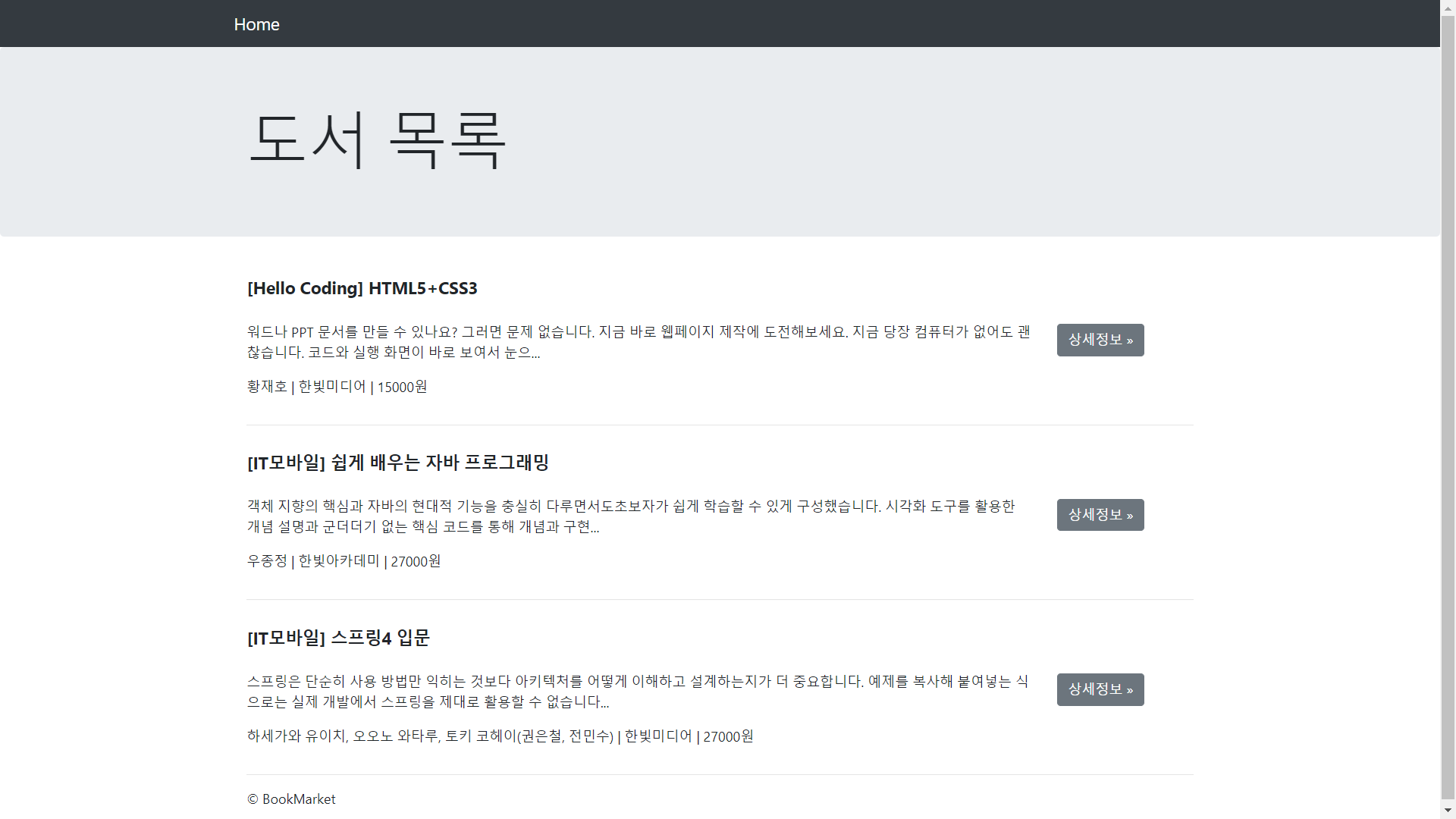 웹 브라우저에 'http://localhost:8080/BookMarket/books.jsp'를 입력하고 해당 페이지에서 <상세정보>를 클릭하며 실행 결과를 확인한다.