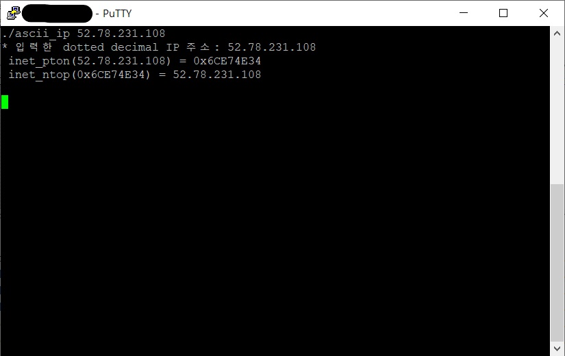 dotted decimal로 표현된 주소(예: 52.78.231.108)를 명령문 인자로 입력하면 이것을 inet_pton()을 이용하여 4 바이트의 IP 주소(hexa로는 6CE74E34)로 바꾸어 화면에 출력하고, 이 IP 주소로부터 inet_ntop()를 호출하여 다시 dotted decimal 주소를 얻는 프로그램이다.