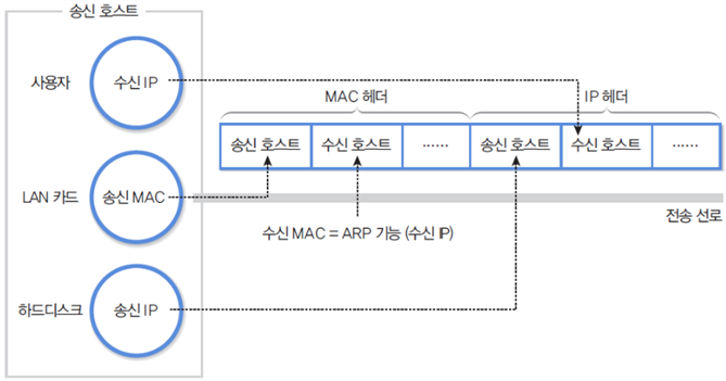 수신 호스트의 IP 주소는 보통 응용 프로그램 사용자가 프로그램을 실행하는 과정에서 직접 입력하므로, IP 주소로부터 수신 호스트의 MAC 주소를 얻는 작업이 추가로 필요하다.